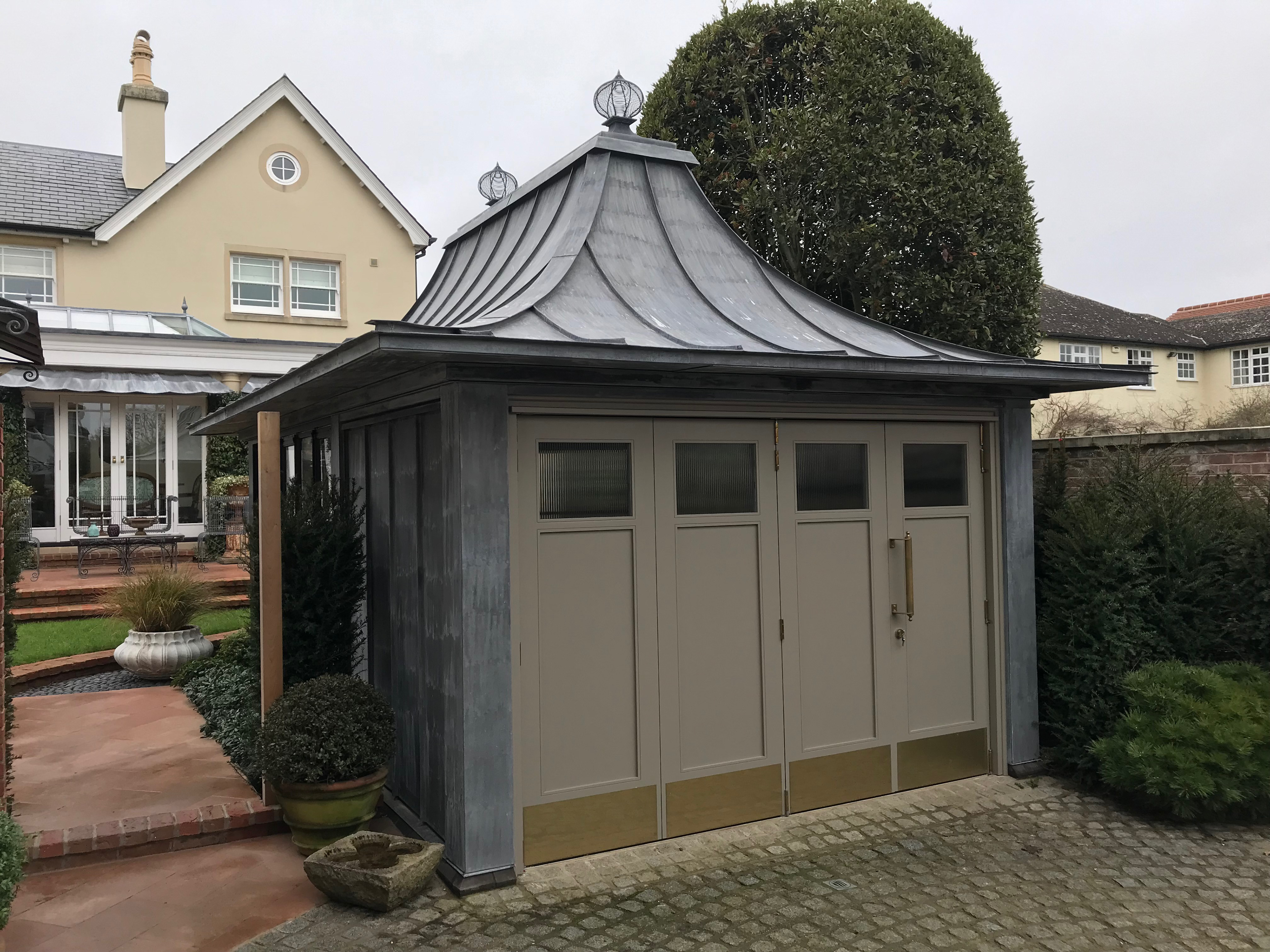 Brief was to construct a bespoke Garage for a 1970 sports car with a zinc coated curved roof with Crittall windows for viewing the car from the house.